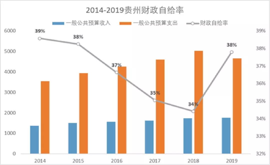 貴州省財政廳數(shù)據(jù)顯示,截至2018年末貴州政府債務余額為8849.81億,在限額以內(nèi)。全國對比來看,債務規(guī)模居全國第六位,但債務率已超100%的警戒線。這一數(shù)據(jù)尚未包含隱性債務規(guī)模。2018年一般公共預算收入1726.80億元,增長7.0%,全年一般公共預算支出5017.32億元,財政自給率34.4%,31個省份中排名22。